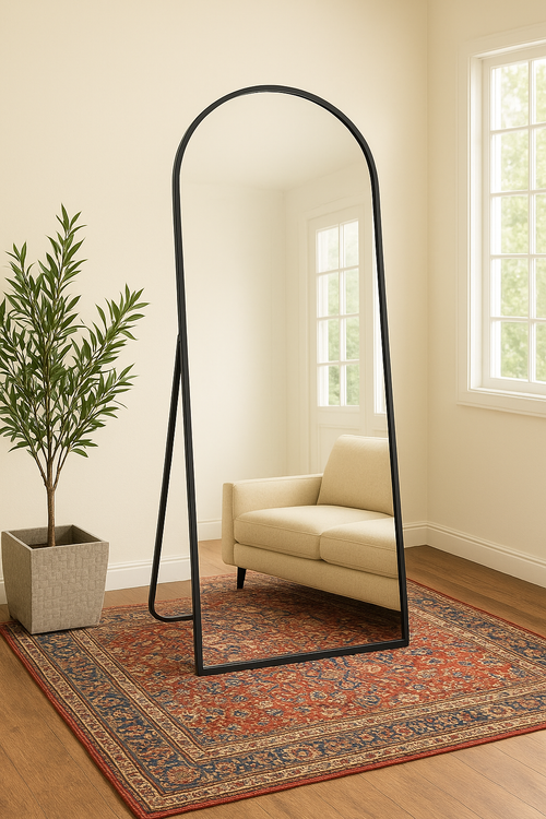 🪞 آینه قدی فریم فلزی هلالی پایه‌دار مشکی 180×80 – رنگ استاتیک
